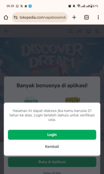 Perlu diketahui bahwa sejak adanya regulasi terbaru dari pemerintah, produk-produk vape tidak lagi bisa diakses melalui aplikasi Tokopedia berbasis Android.